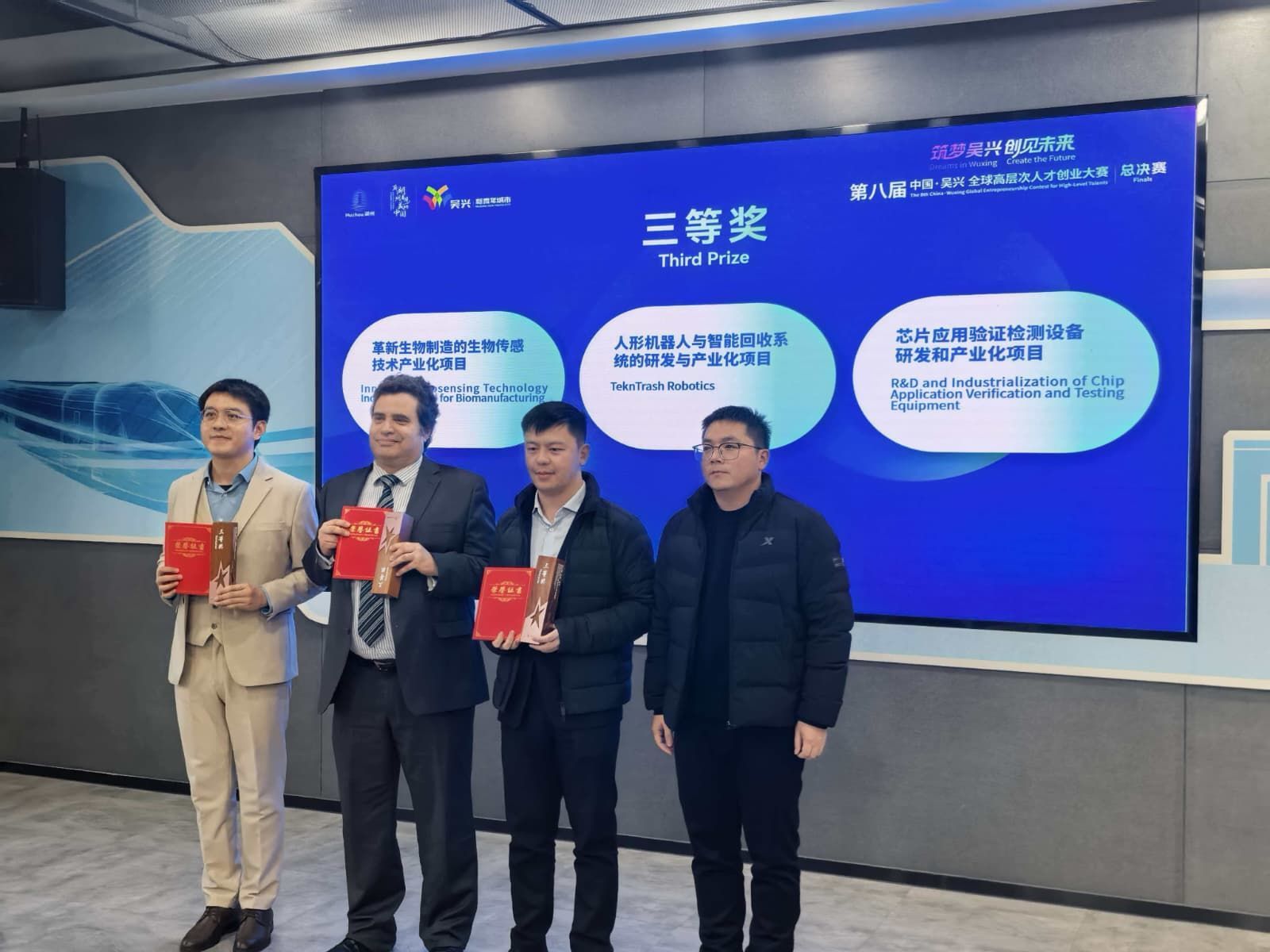 We are honoured to share that TeknTrash Robotics has been awarded 3rd Prize at the Global Entrepreneurship Contest in Huzhou, China. Selected through a competitive expert review process, our project was recognised for its technical maturity, industrial scalability, and global relevance. Among 12 high-tech teams, TeknTrash was the only international company to receive an award, a strong validation of the real-world potential of our ALPHA humanoid robot. The competition was organised by the Wuxing District Government, a region actively building a robotics and advanced manufacturing ecosystem, aligned with the broader innovation momentum seen across the Yangtze River Delta.In the photo, our CEO Al Costa receives the prize along with the other awarded companies